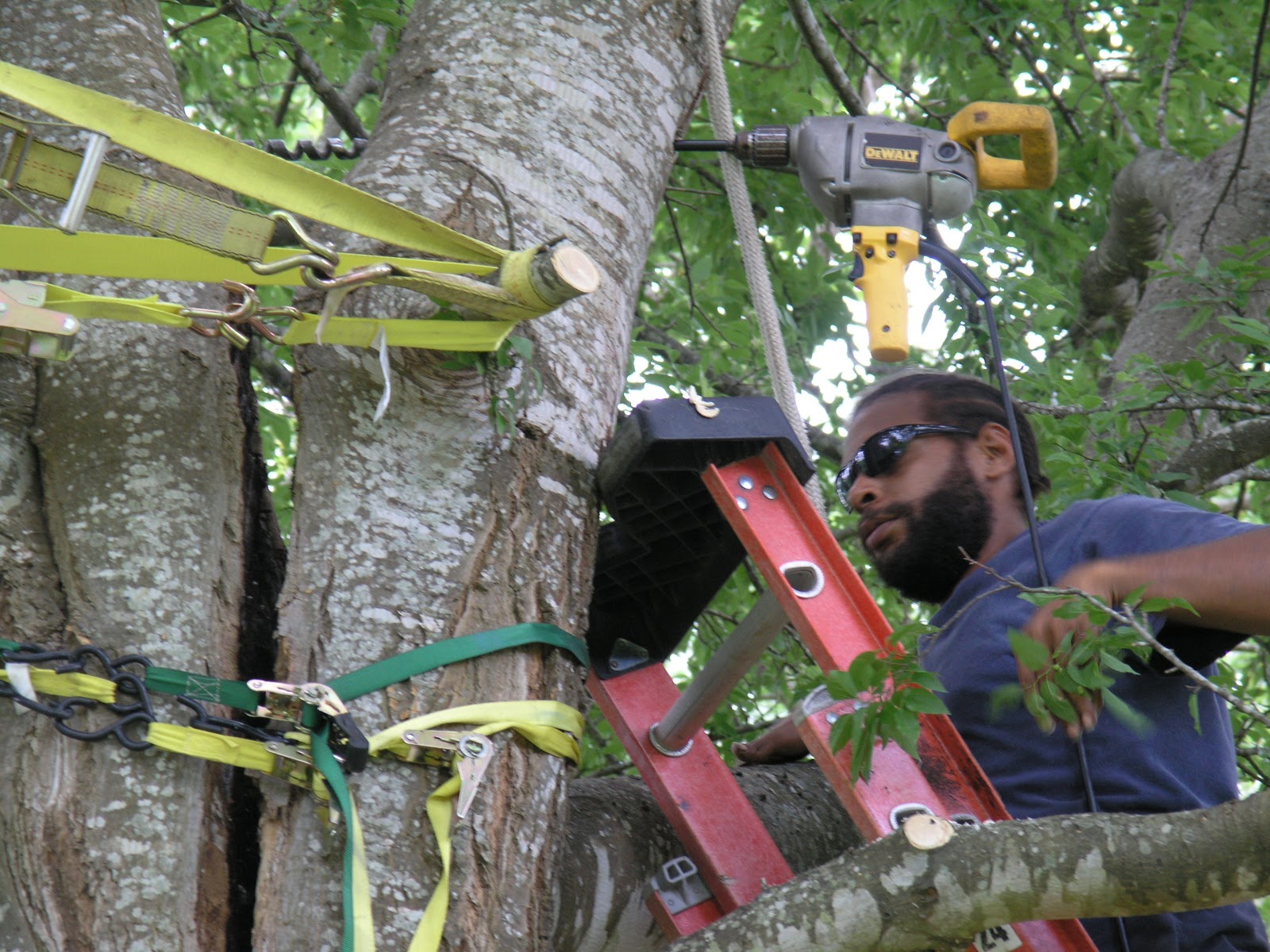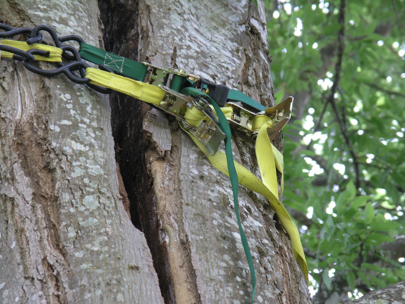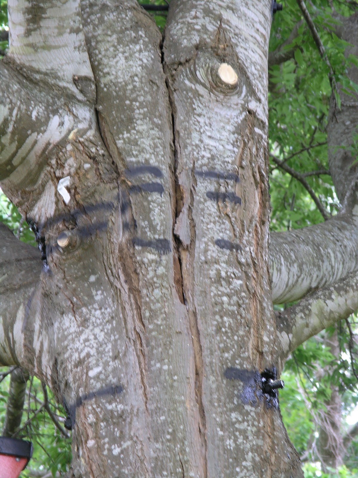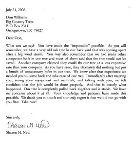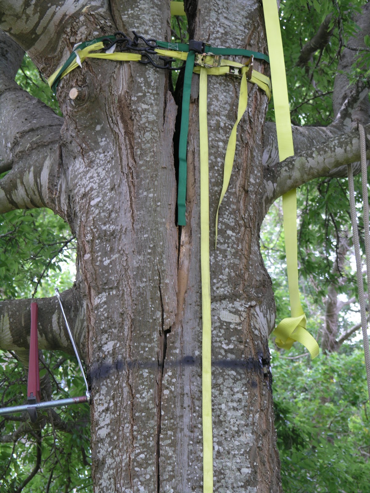 We are well-known for our expertise in the critical area of putting split trees back together. Some large, valuable trees need cables and/or bolts to prevent splitting of trunks or breakage of very long, large limbs. Here is a letter from one of our satisfied customers, followed by a slideshow of the original job in 2008, our follow-up years later, plus some other split tree repair successes: